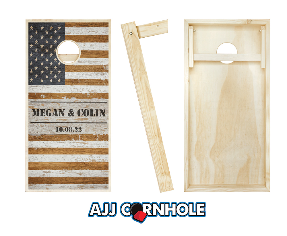All sets are made using a premium 2x4 frame and 1/2" sanded plywood playing surface. These cornhole game boards feature folding 2x4 legs secured with galvanized bolts.