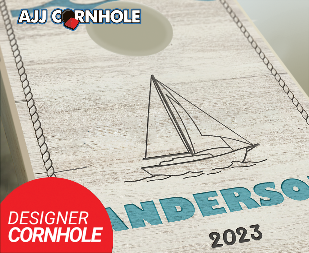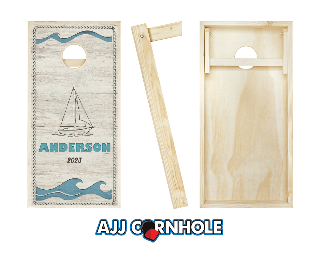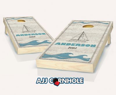"Nautical Sailing Waves on Wood" Cornhole Set