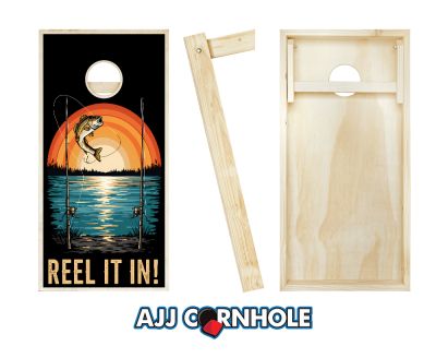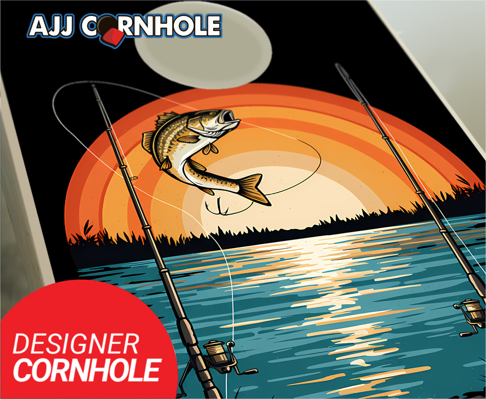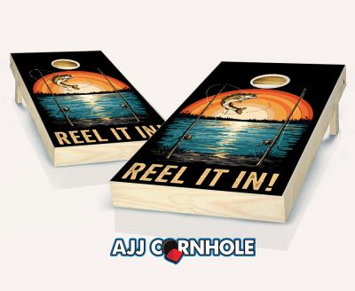 "Reel it In Bass Line Jumping Fish out of Water Sunset" Cornhole Set