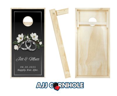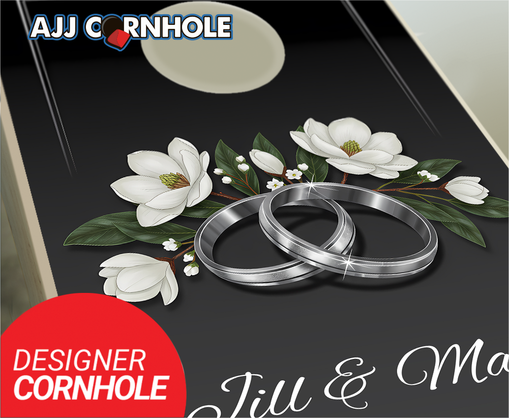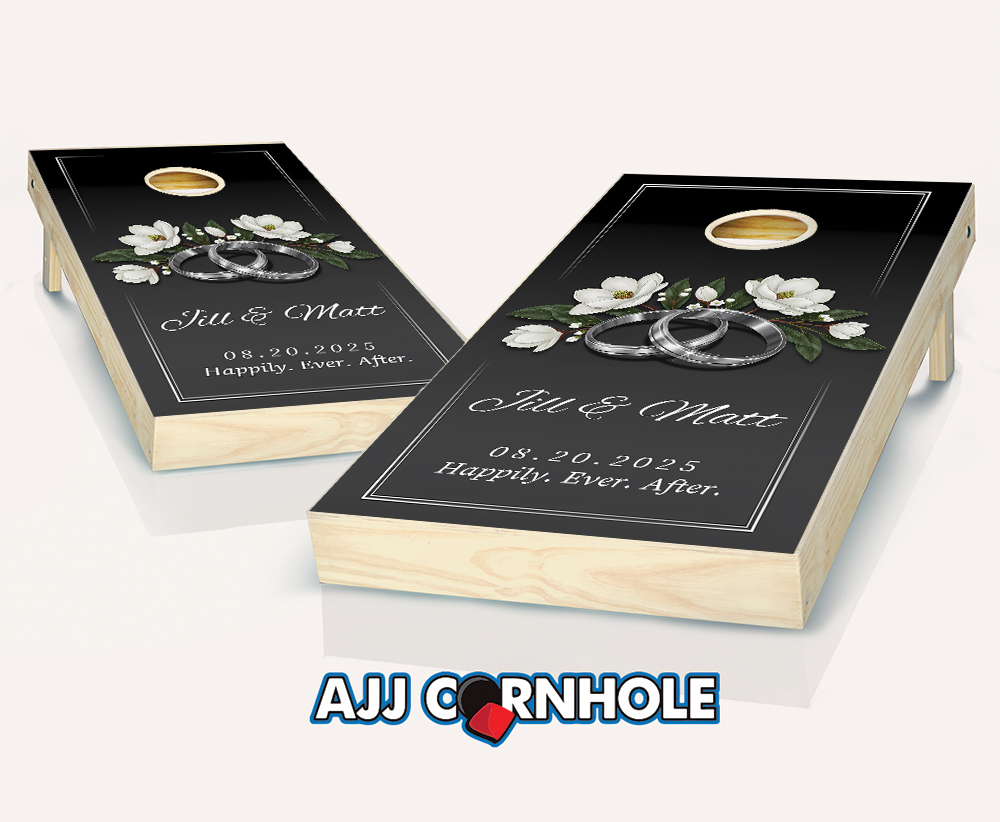 "Wedding Rings White Flowers on Black" Cornhole Set