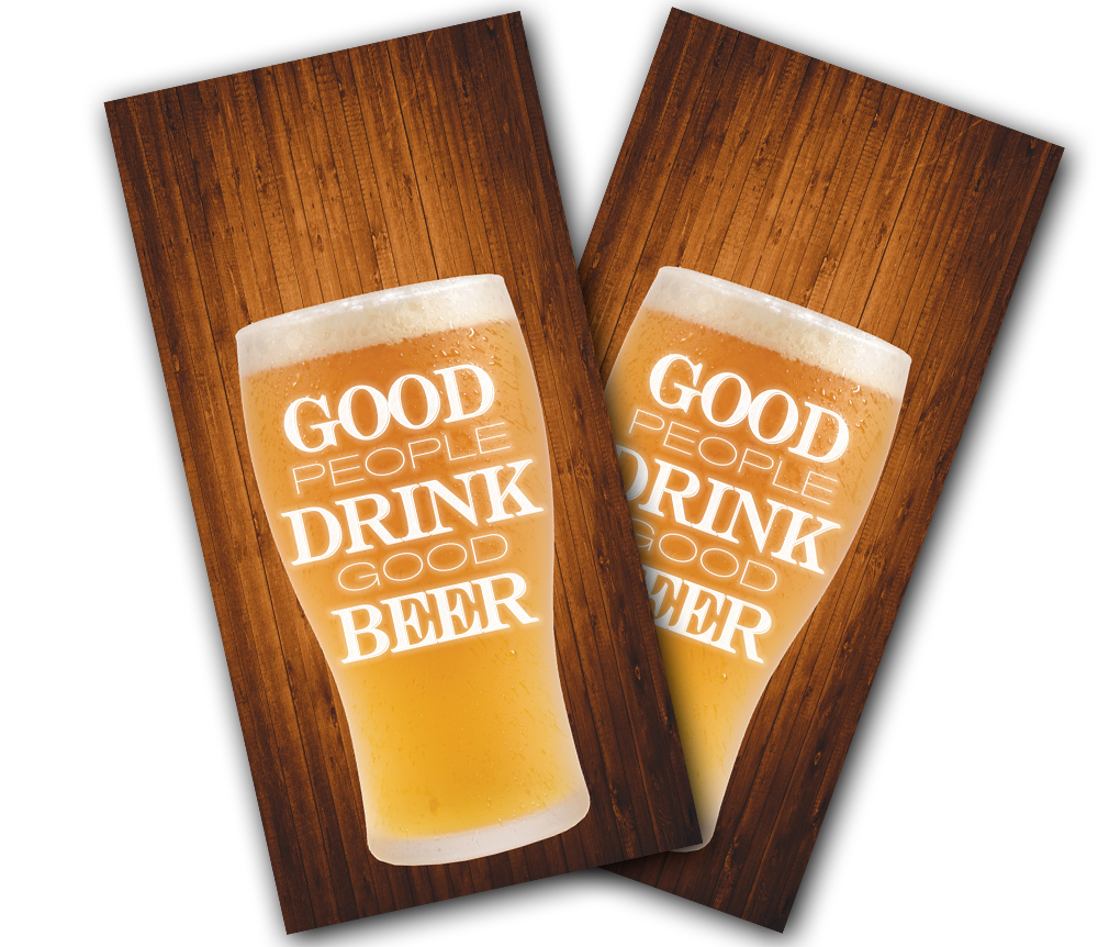 These "Good people drink good beer" beer drinking cornhole wraps set the tone for a fun night! Turn your old boards in something new. Our beer cornhole wraps measure 48in x 24in and will fit any regulation cornhole set. Hole is not cut out to allow for proper trimming on a set by set basis. Add a hand squeegee to assist with installation.